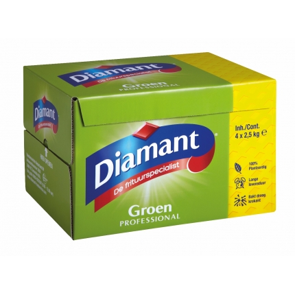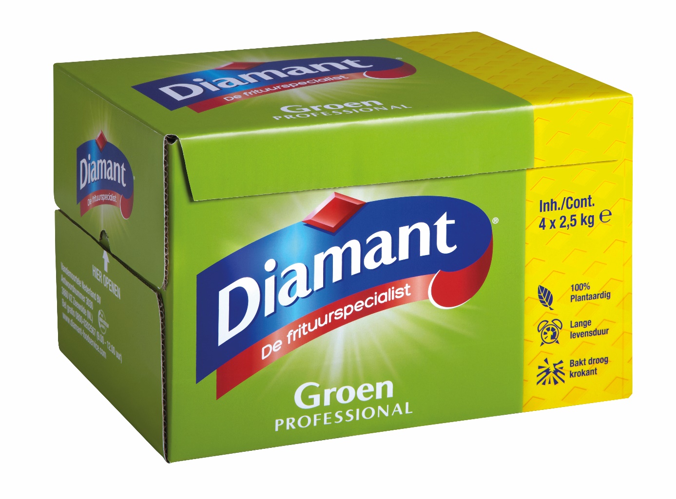 Info: Hoewel de vloeibare frituurvetten van Diamant beter zijn voor de gezondheid en inmiddels minstens zo goed bakken als vast frituurvet, kent vast frituurvet nog steeds een grote groep trouwe gebruikers. Met het innovatieve Groen wil Diamant gezonder frituren voor iederéén toegankelijk maken. Diamant Groen vervangt Goud en Delfrite, waarvan de productie is gestopt.